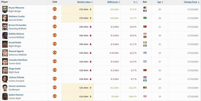 北京时间10月17日,德国转会市场更新了英超球员的最新身价。曼联队内,姆贝莫身价增加1500万欧元,拉芒斯身价增加1100万欧元,库尼亚身价增加1000万欧元,乌加特身价减少1000万欧元。曼联球员身价变化(单位:欧元) 姆贝莫,增加1500万,现身价7000万 马特乌斯库尼亚,增加1000万,现身价7000万 布鲁诺·费尔南德斯,下跌500万,现身价4500万 菜单,减少500万,现身价4500万 阿马德·迪亚洛,减少500万,乌加特身价4000万,减少10百万,价值 350 Lisandro Martineze,下降 现身价3 Ang Million Dalot,下降200万,身价2800万 Zirkzee,身价下降200万,身价2800万Ramen,上升1100万,身价2000万 Ayden Haven,增加500万,身价1000万(注:球员不包含在名单中)保持原有数值,本期不再更新)【咪咕独家观看英超】
